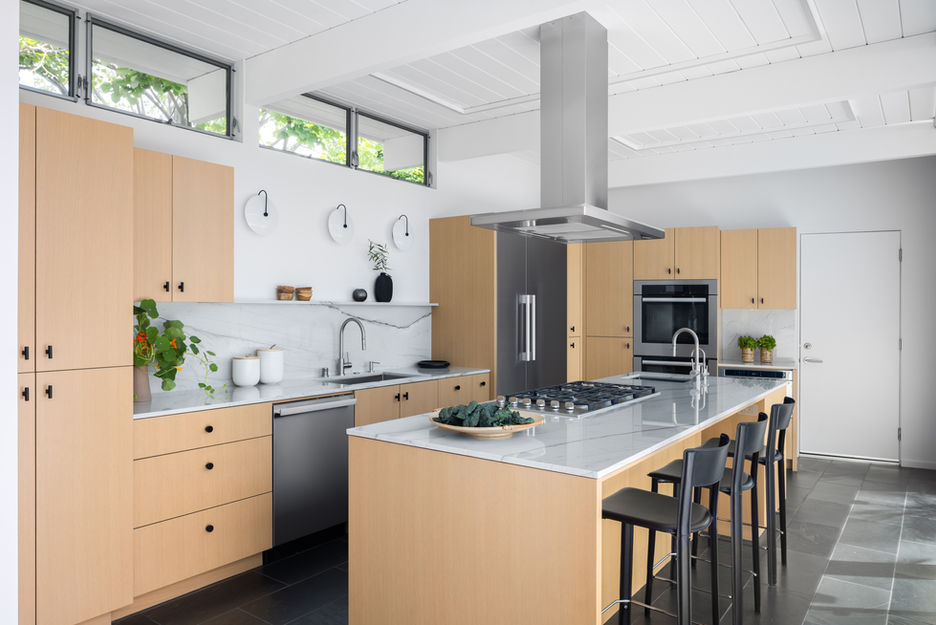 This Eichler had all of the elements of a traditional mid-century treasure – an open, one-story floor plan with a private wing for bedrooms, extensive floor-to-ceiling windows and clean lines. Its understated nature nestled beautifully into the lush landscape surrounding it, inviting indoor-outdoor living. The homeowners valued time in their kitchen, cooking for friends and loved ones, so as a result of this, we made it a priority to improve the kitchen layout to maximize function. To achieve a modern and inviting space, we incorporated warm wood finishes and organic materials, juxtaposed against clean lines and mixed metals. We crafted a layered approach to lighting with custom sconces, and implemented quarter-sawn white oak custom cabinets with natural quartzite countertops and backsplash, complimented by slate flooring. In the bathrooms we took the same approach – specifically, in the primary bath we removed a wall to extend the vanity, opening up the space to bring in additional light to this airy and fresh home.